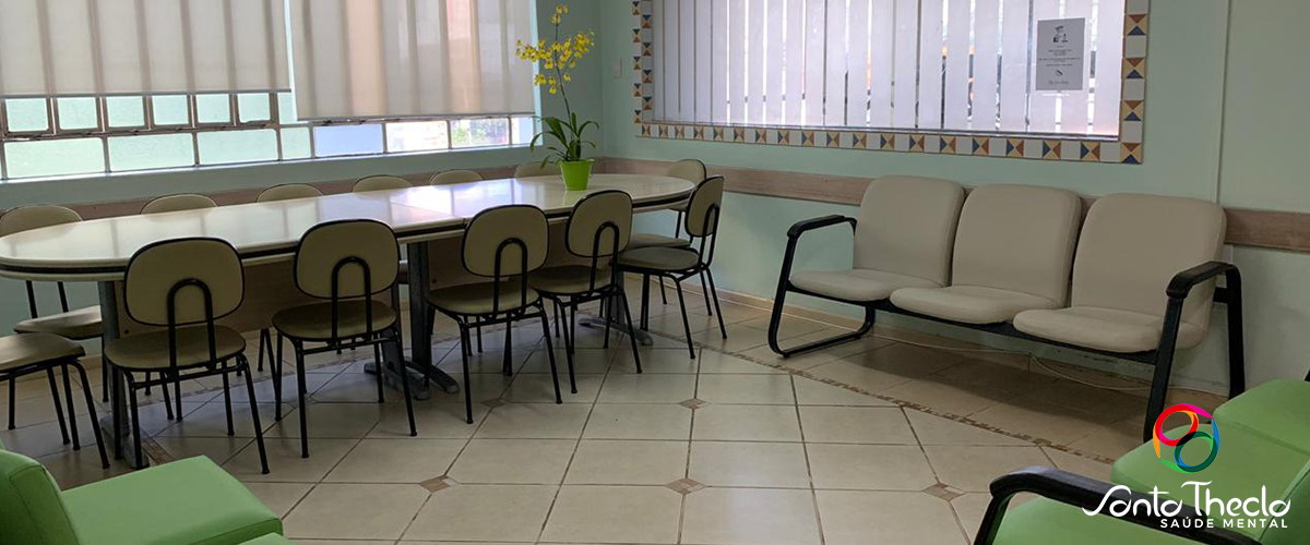 Este é um dos nossos espaços de convívio, onde os pacientes participam de grupos terapêuticos e recebem familiares ou profissionais da clínica entre outras atividades.